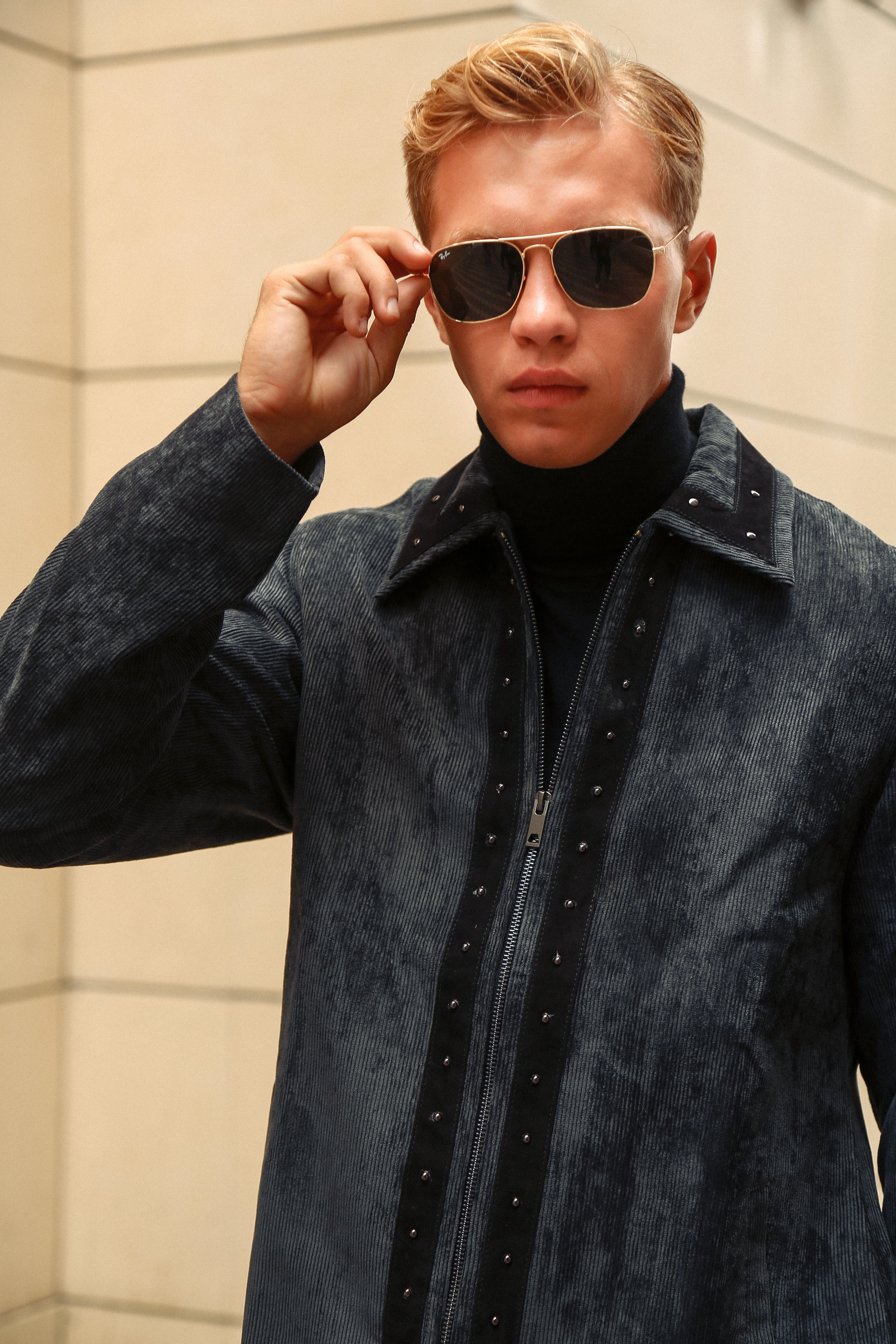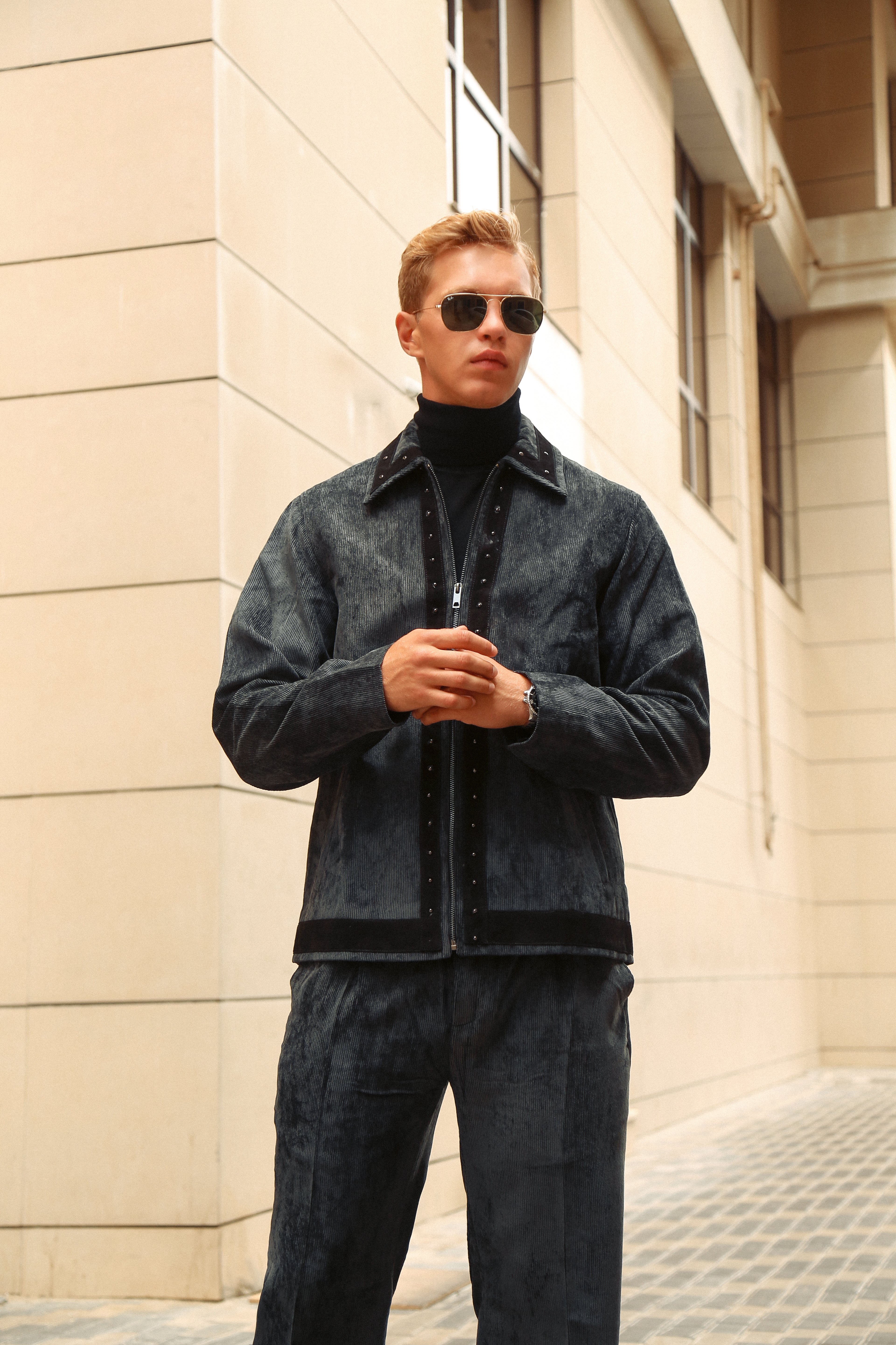 A modern expression of rugged sophistication, this corduroy jacket and trouser set is elevated with genuine cow suede detailing and metal rivet accents. The mix of soft corduroy texture and refined suede adds a luxurious yet contemporary appeal — perfect for statement winter styling.