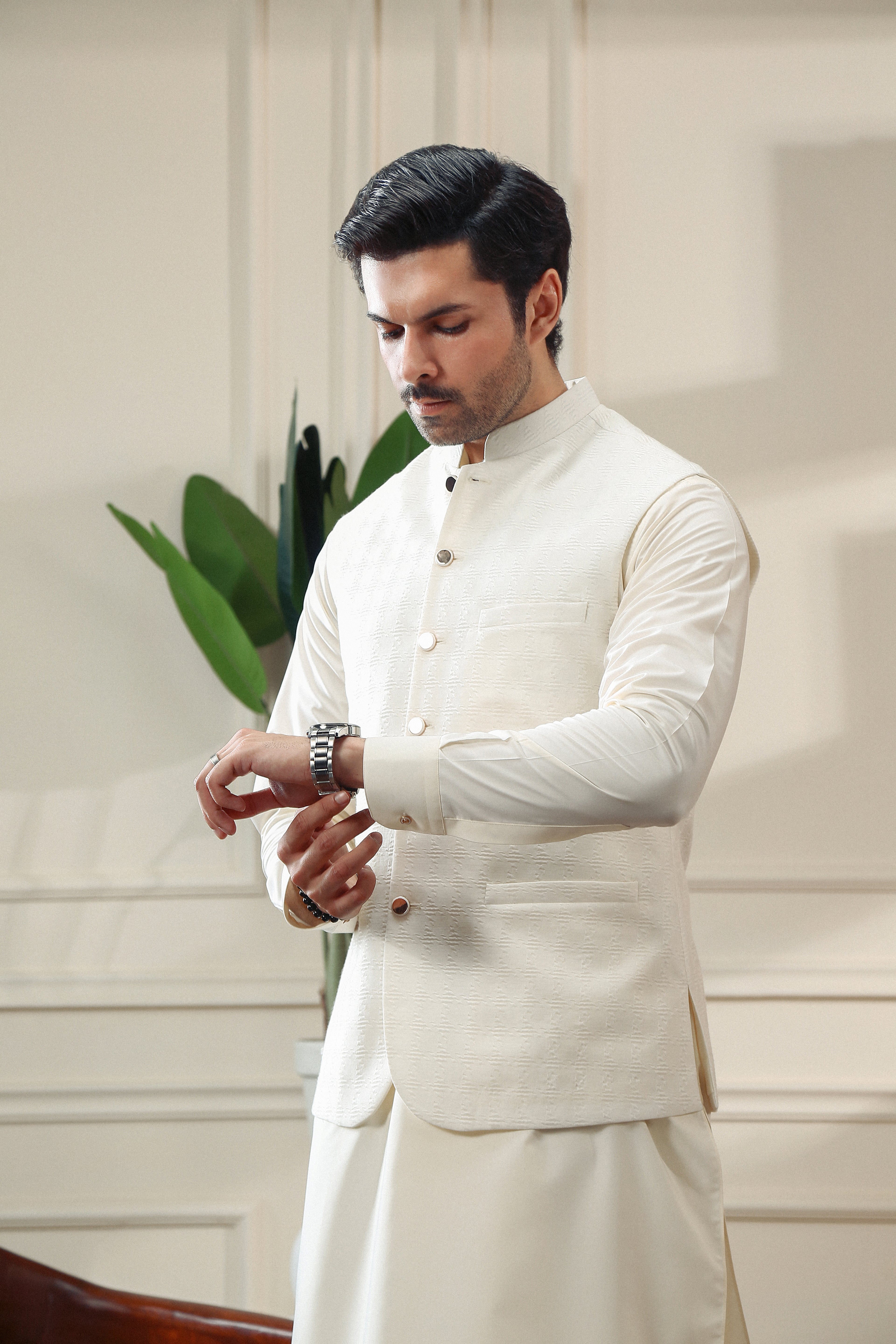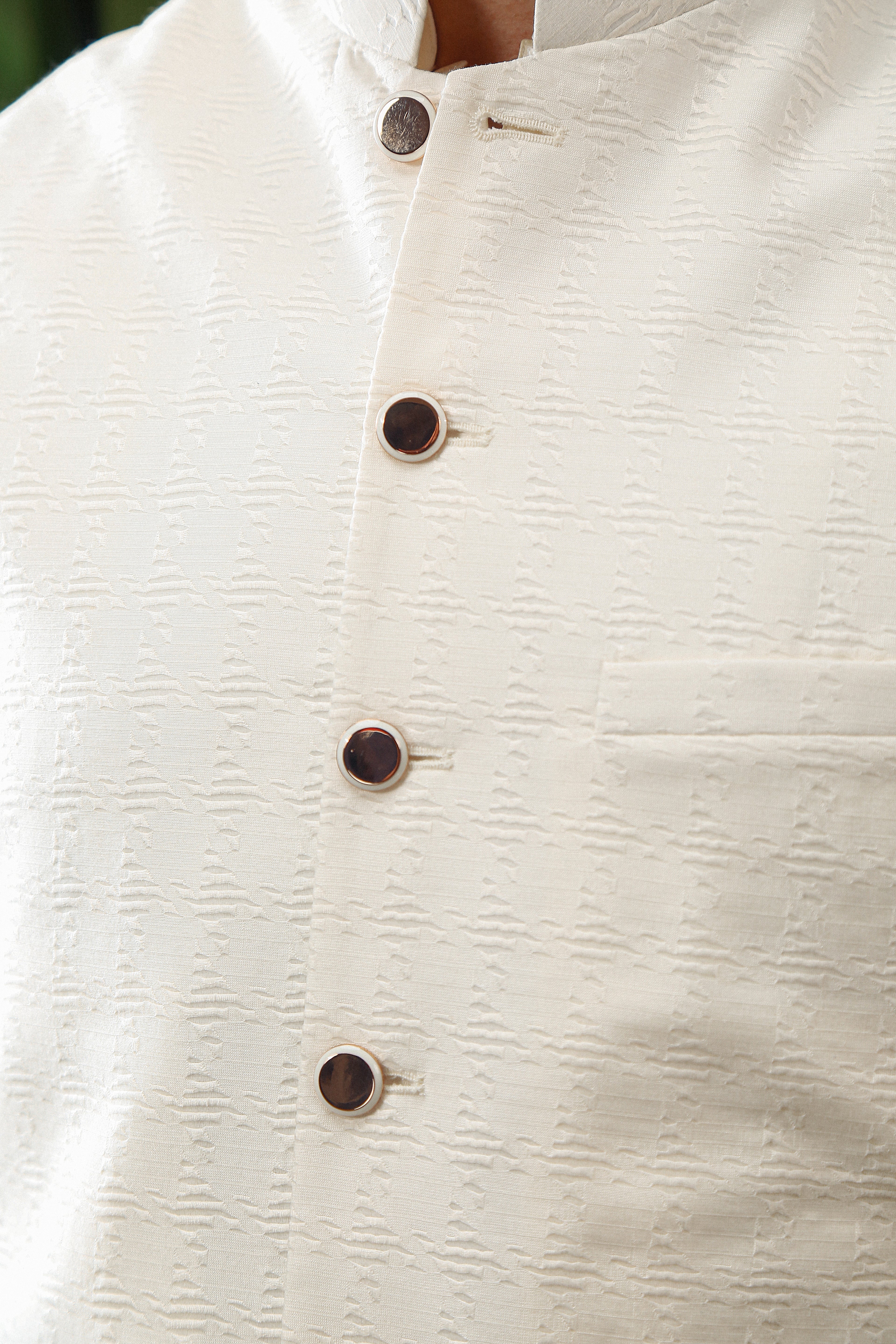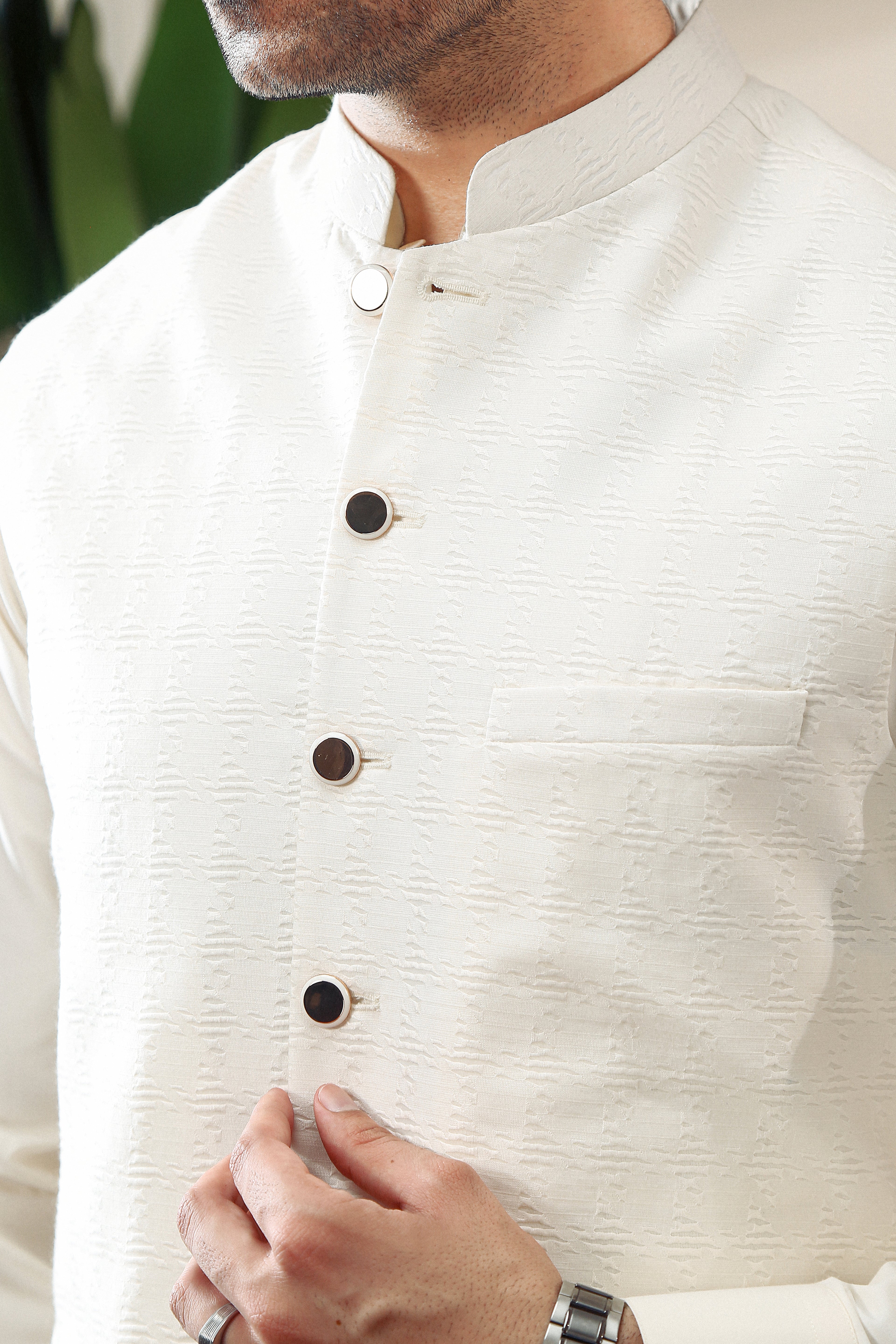 Elevate your traditional wardrobe with this refined waistcoat, meticulously crafted from specially woven jacquard fabric that offers rich texture and subtle visual depth. The off-white hue brings timeless sophistication, while the metal button detailing adds a polished finish.
