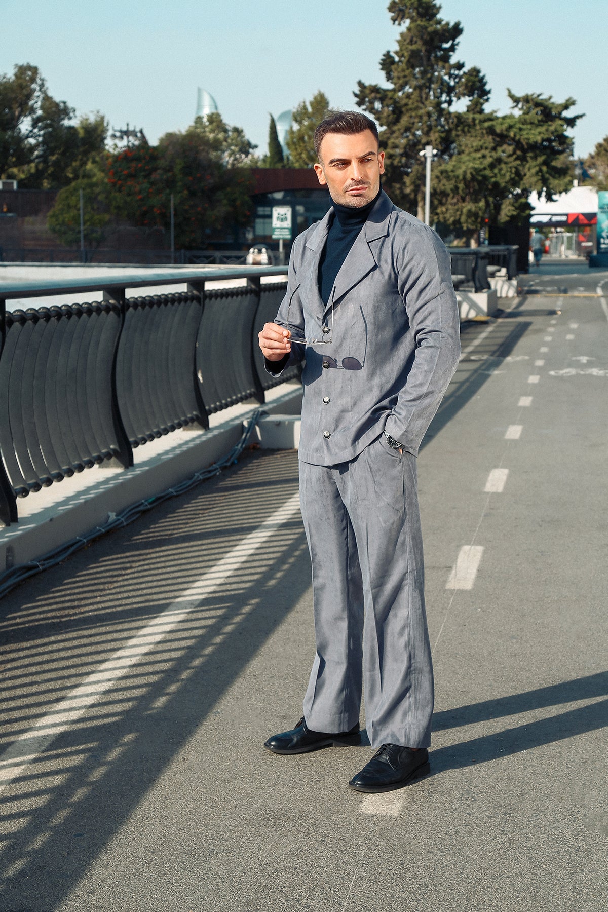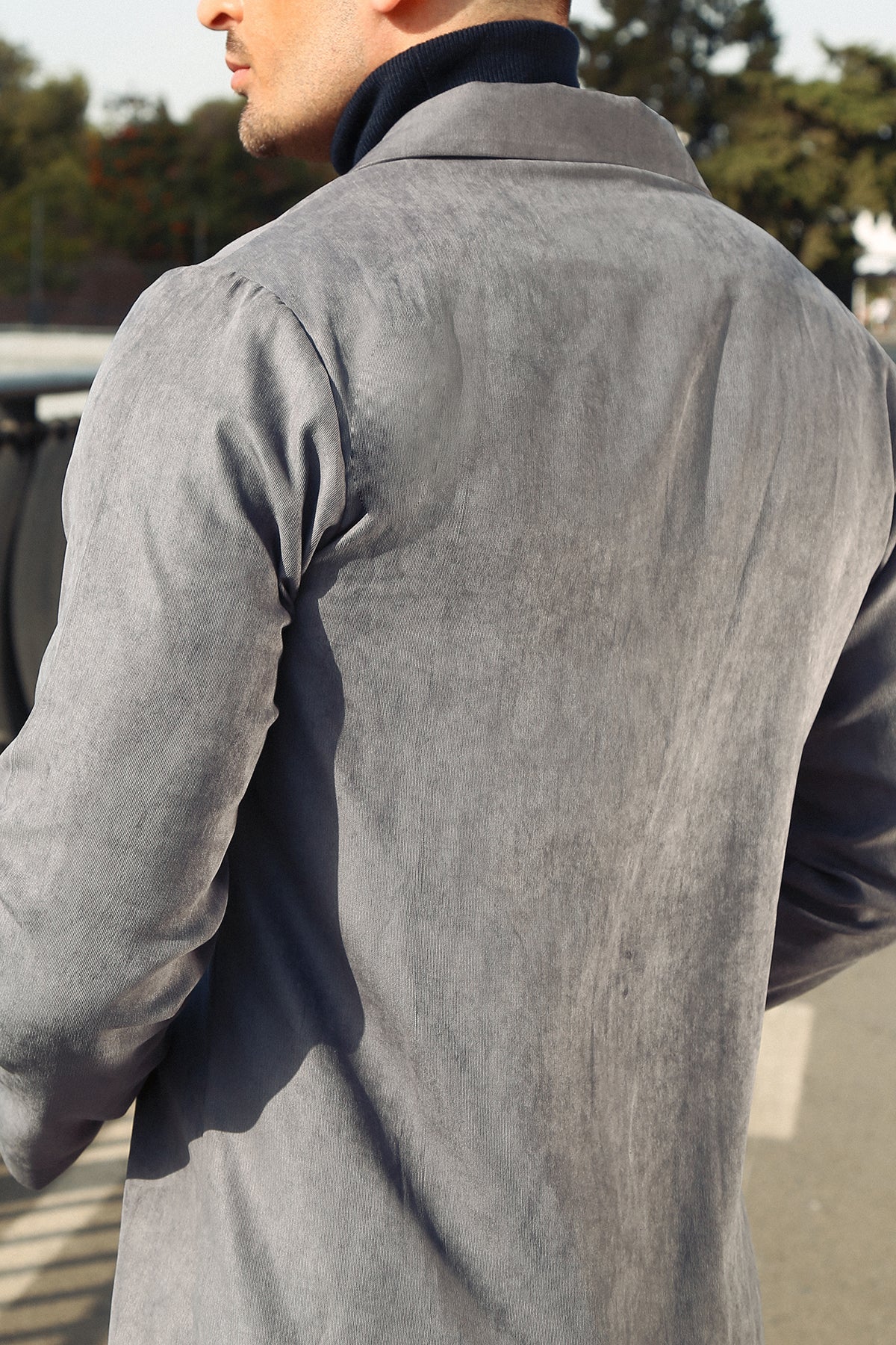 A modern co-ord set crafted from a premium suede-blend fabric, featuring a label collar design that adds refined structure and style.