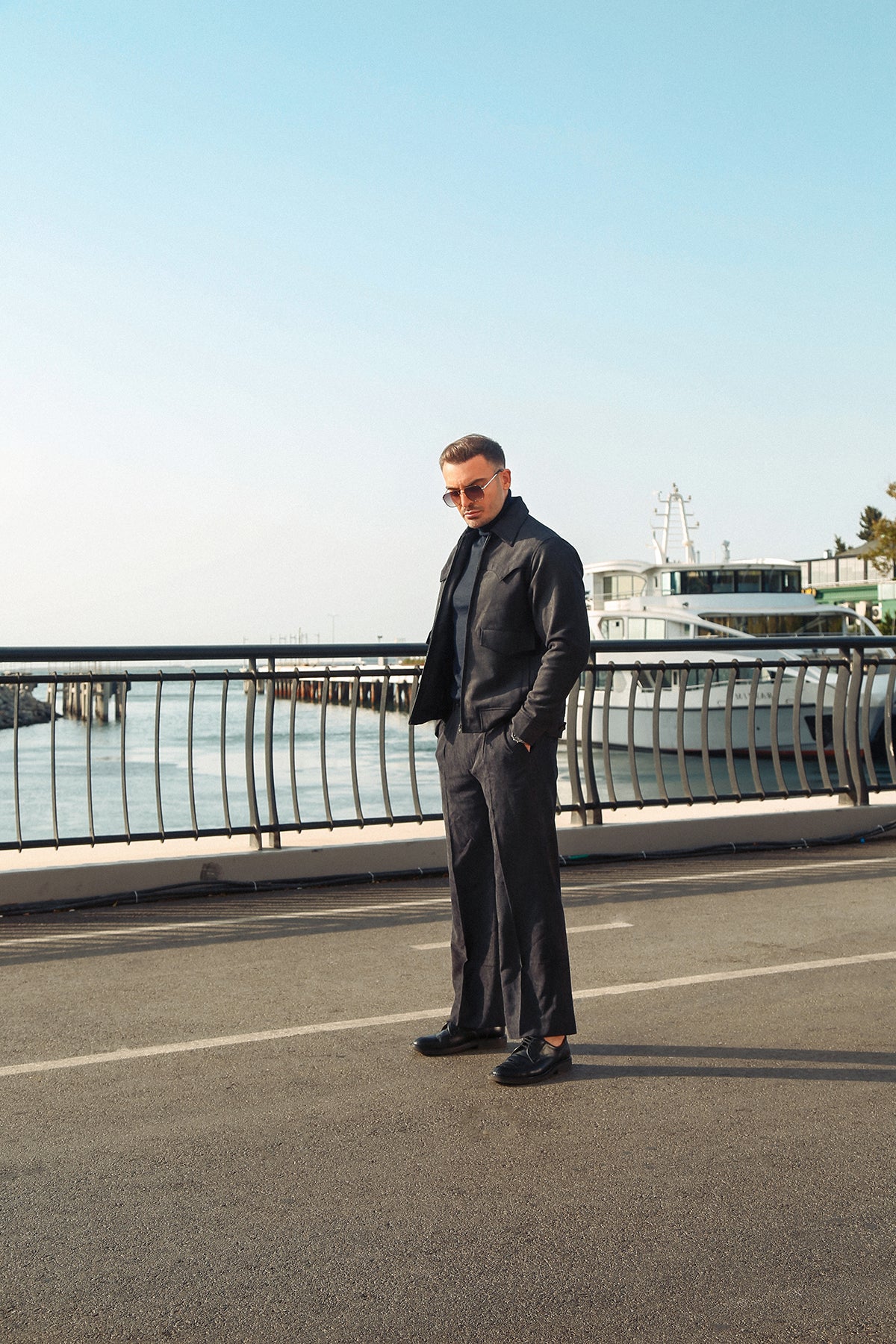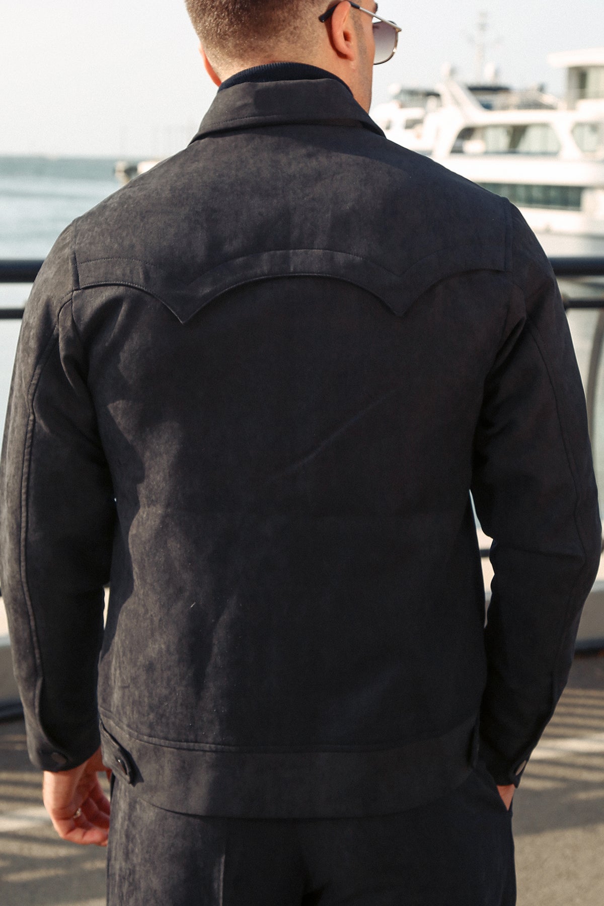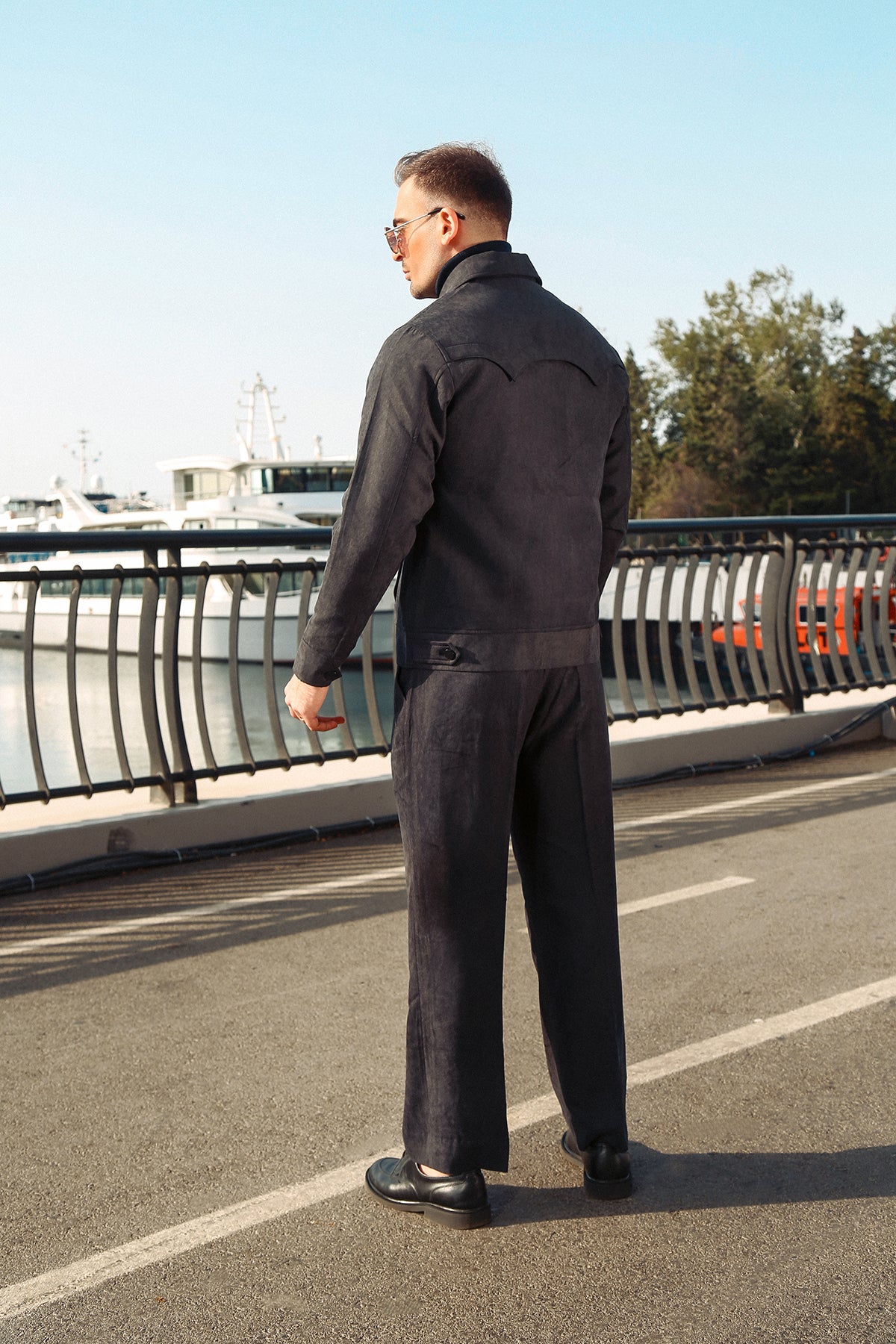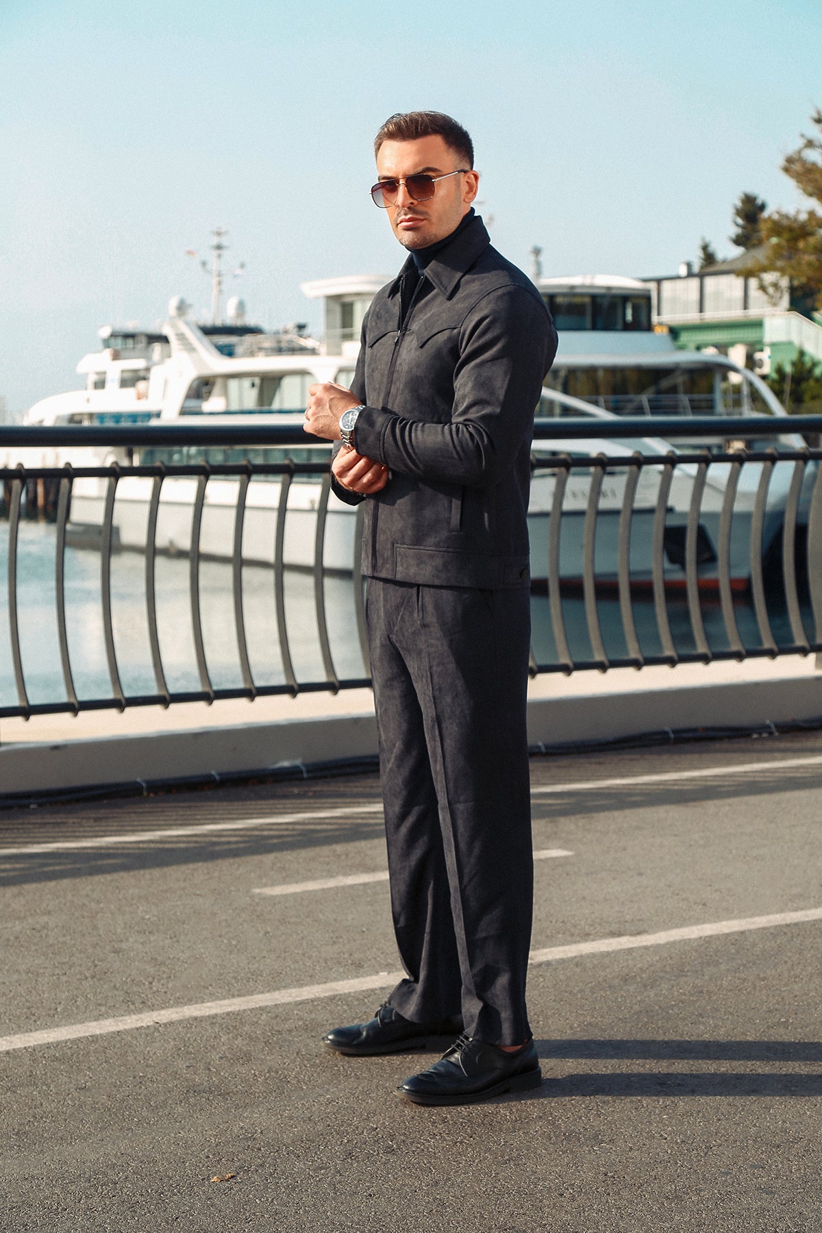 A contemporary jacket and trouser set crafted from luxurious suede fabric, designed with a fashion-forward silhouette that redefines modern outerwear. This co-ord set blends tactile richness with directional design, offering a bold yet refined statement look.