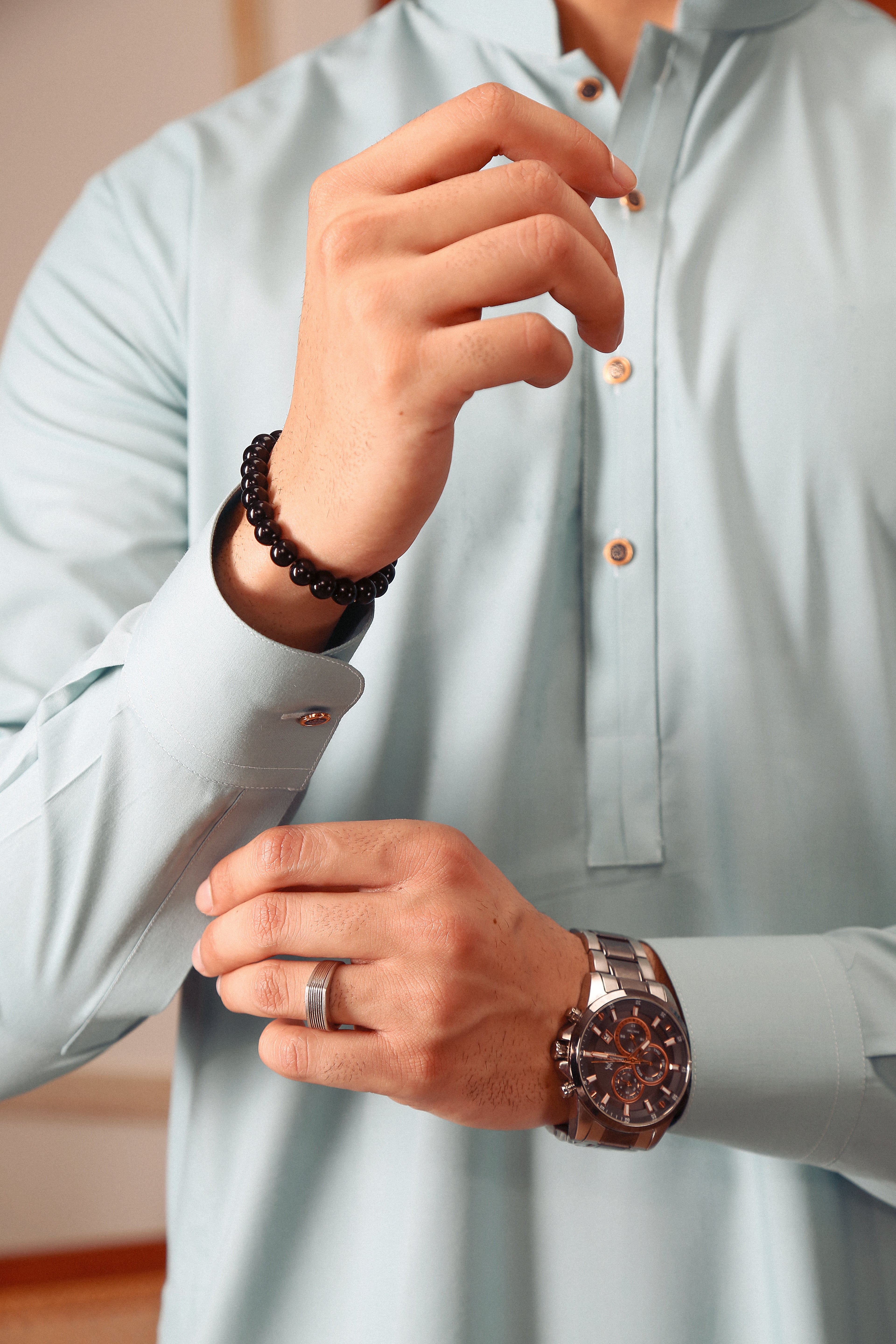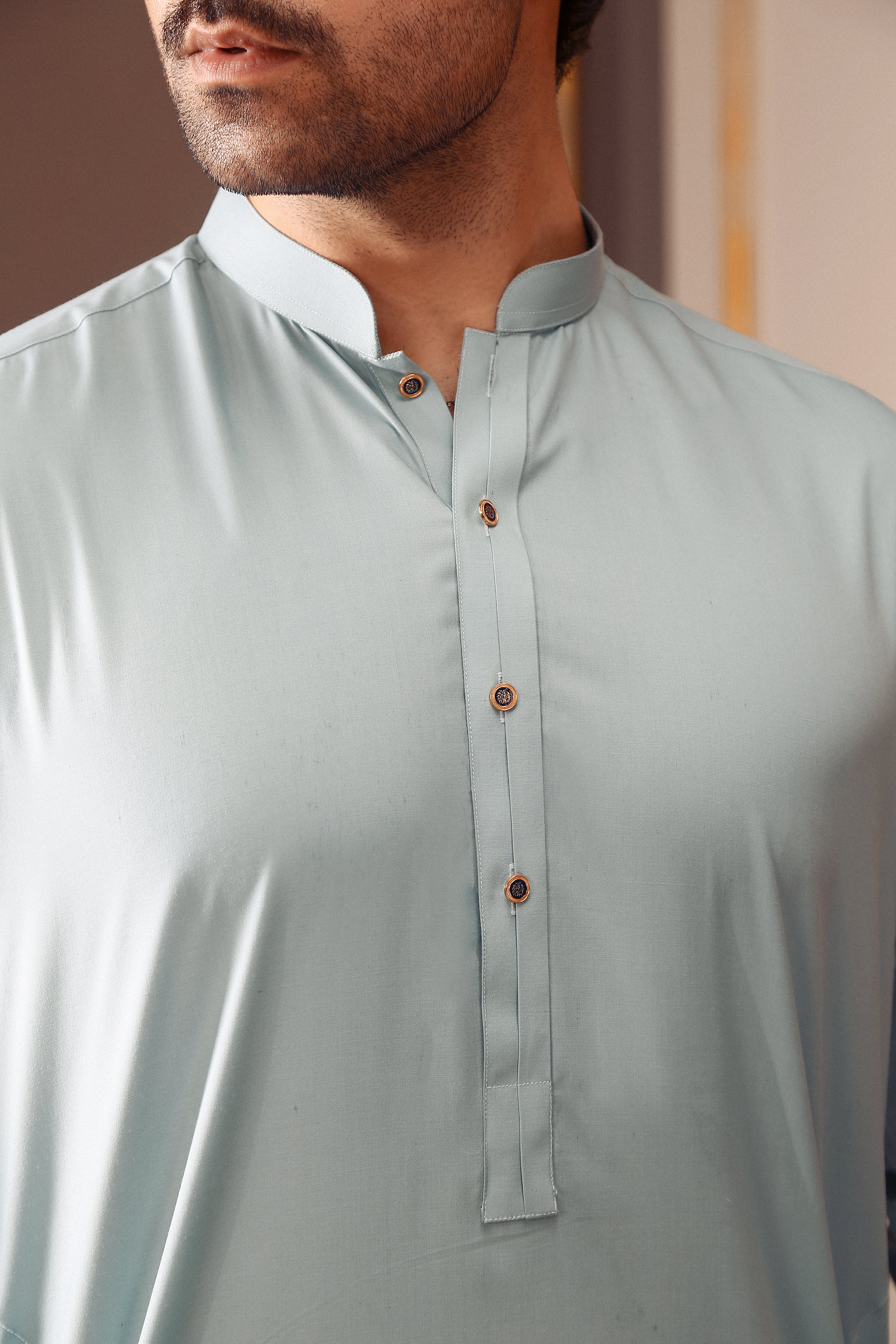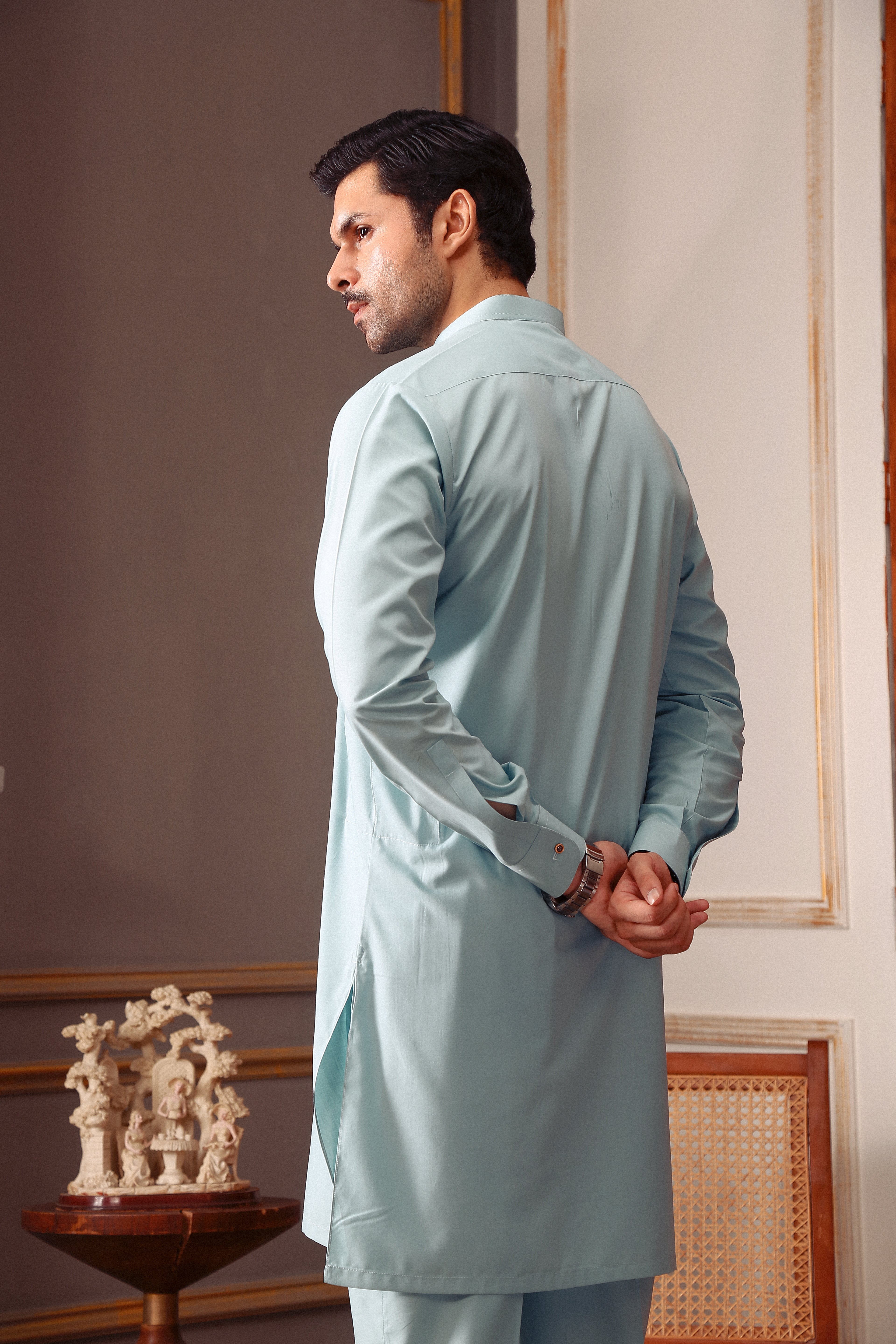 This kurta trouser set features a half-hidden placket that creates a seamless front, paired with polished metal buttons for subtle shine. Crafted for men who prefer minimalist design with refined details.
