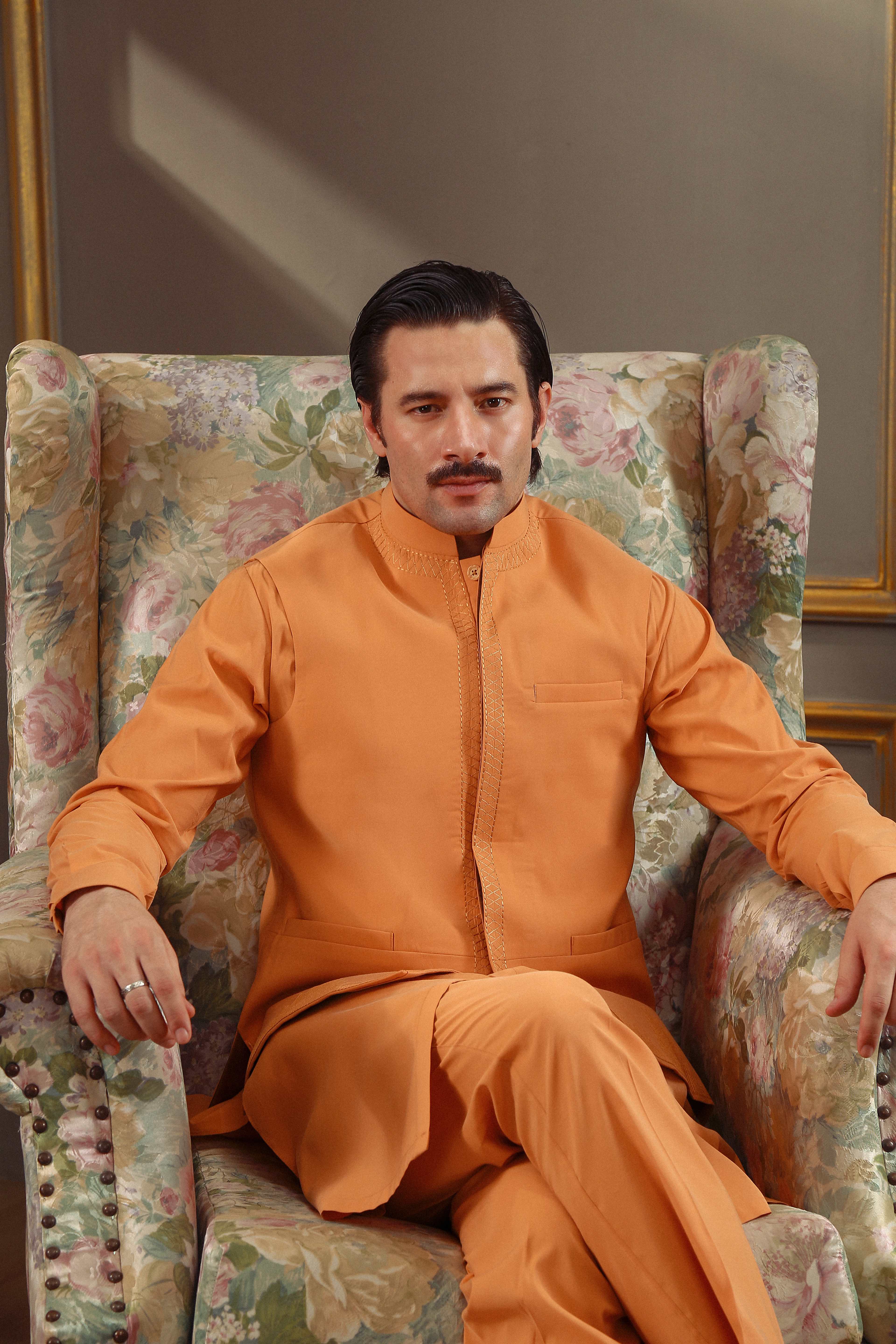 This exquisite Festive/Party Wear cotton waistcoat for men in a stunning Mustard shade is a versatile piece for all seasons. Featuring a Regular Fit, intricate Embroidery work adds a touch of elegance. Perfect for special occasions, this one-piece outerwear by Haris Hassaan is a must-have in any wardrobe.